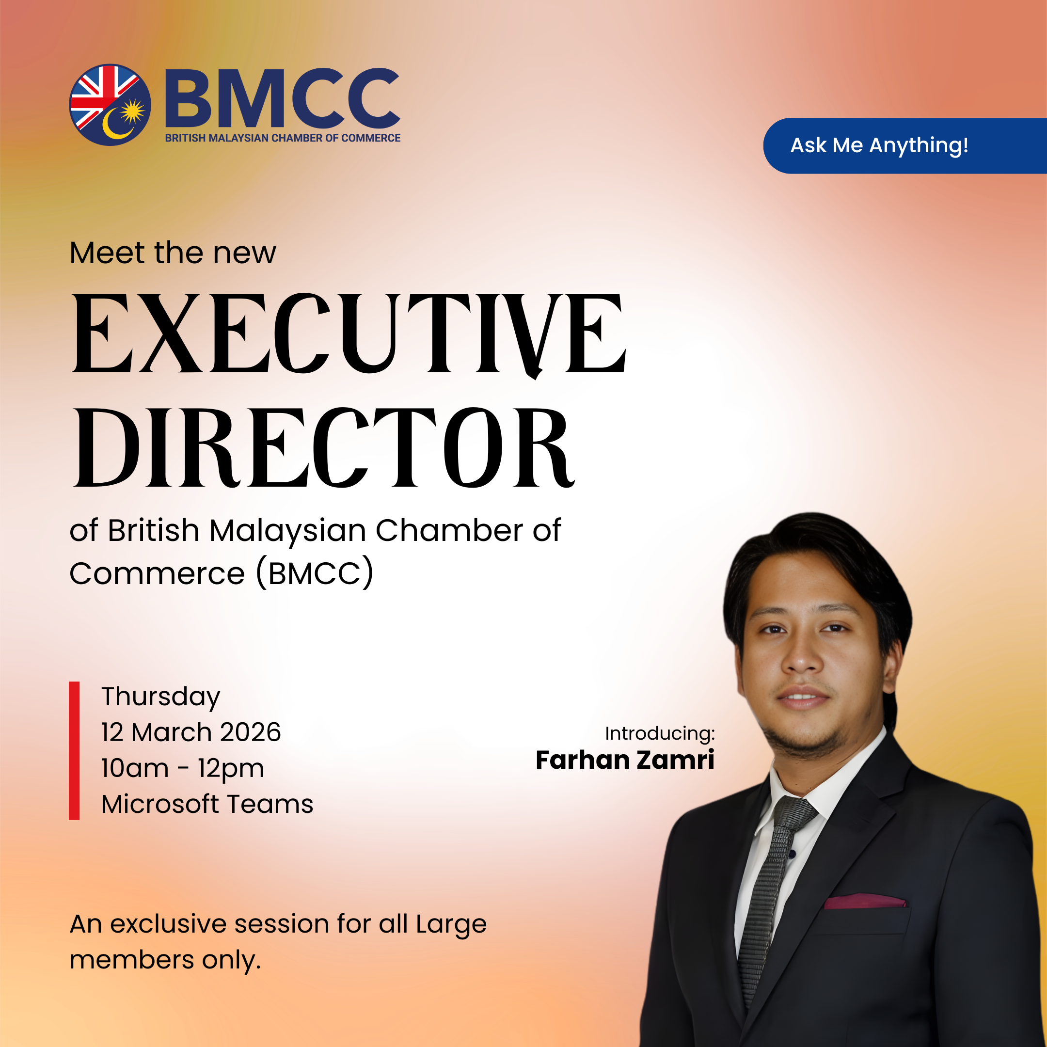 Following the appointment of Farhan Zamri as Executive Director of the British Malaysian Chamber of Commerce, we are hosting two dedicated online engagement sessions for our Large Members and SME Members.