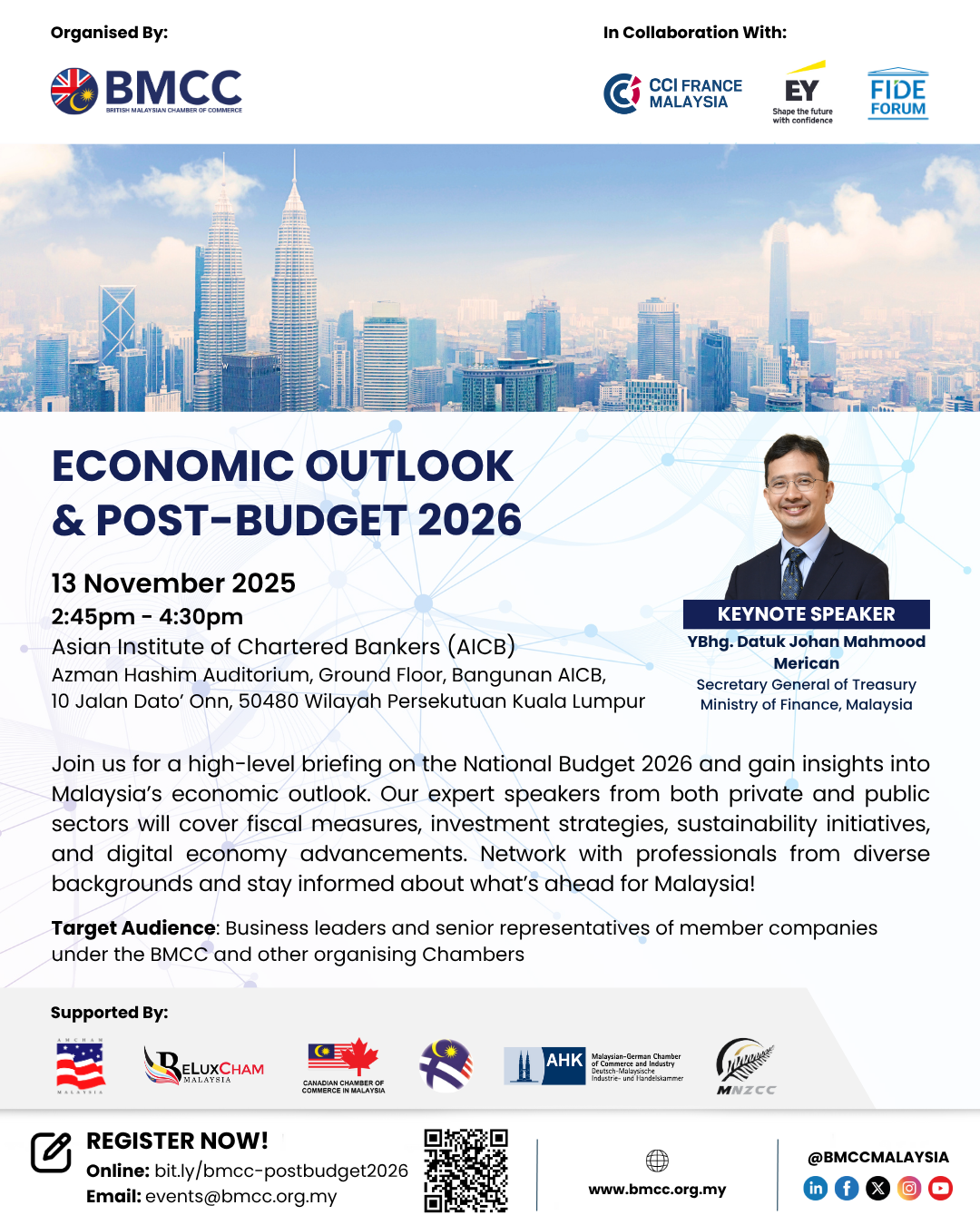 Join us for a high-level briefing on the National Budget 2026 and gain exclusive insights into Malaysia’s economic outlook. We are thrilled to announce YBhg. Datuk Johan Mahmood Merican, Secretary General of Treasury, Ministry of Finance, Malaysia as our Keynote Speaker!
