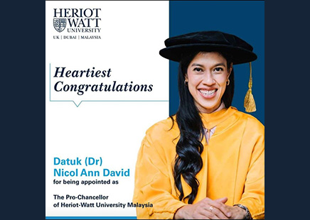 Retired squash ace Datuk Nicol David added another feather to her cap when she was appointed the Pro Chancellor of Heriot-Watt University of Malaysia today.