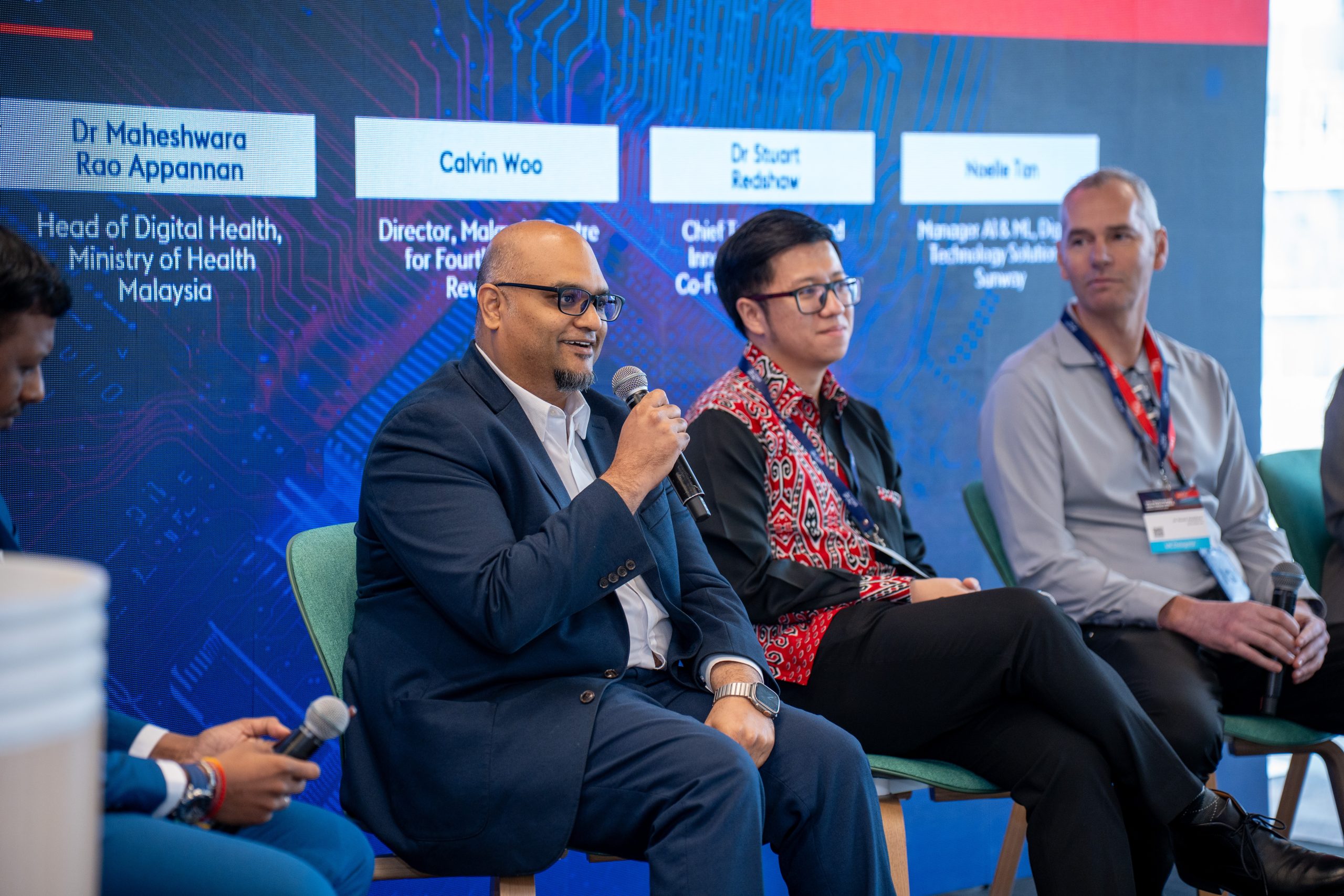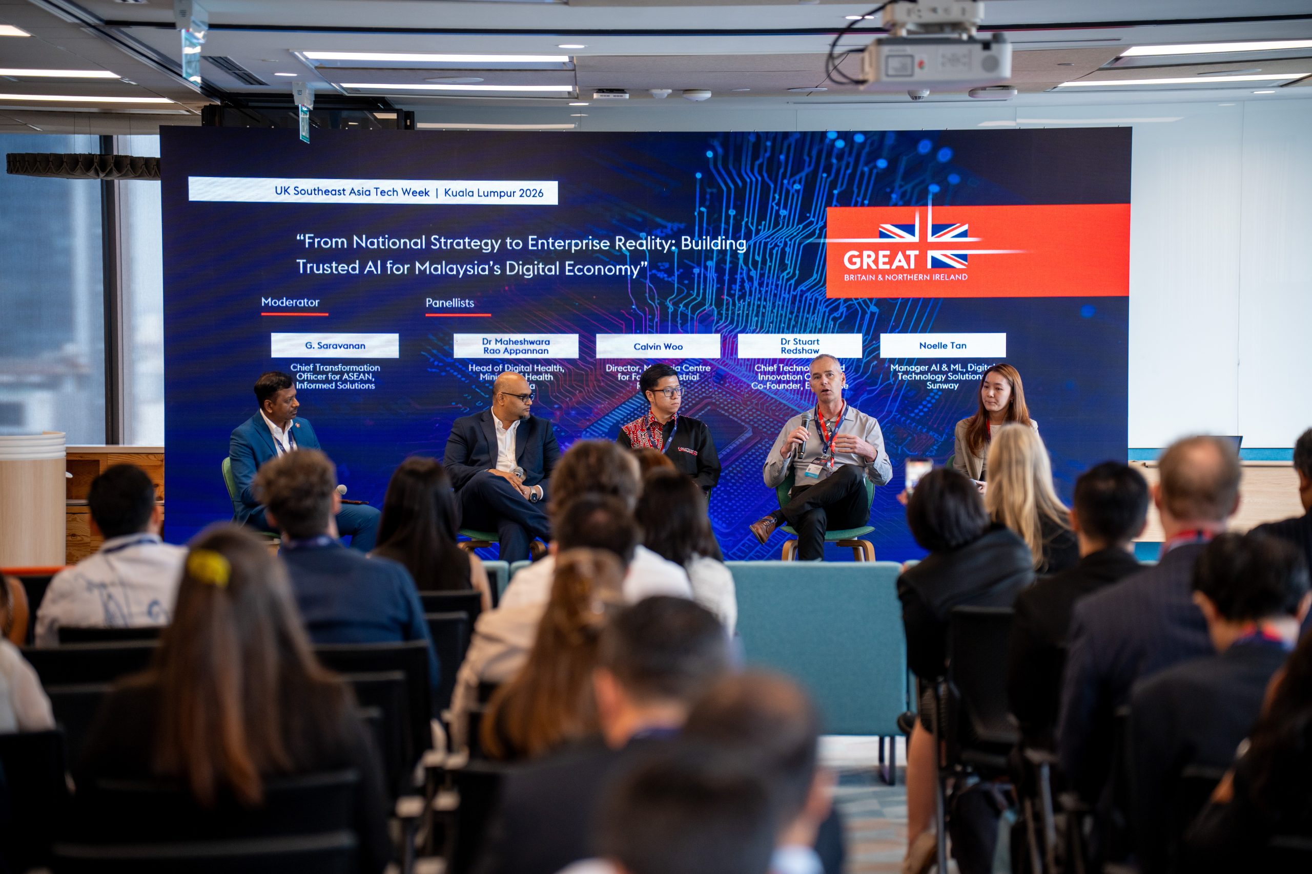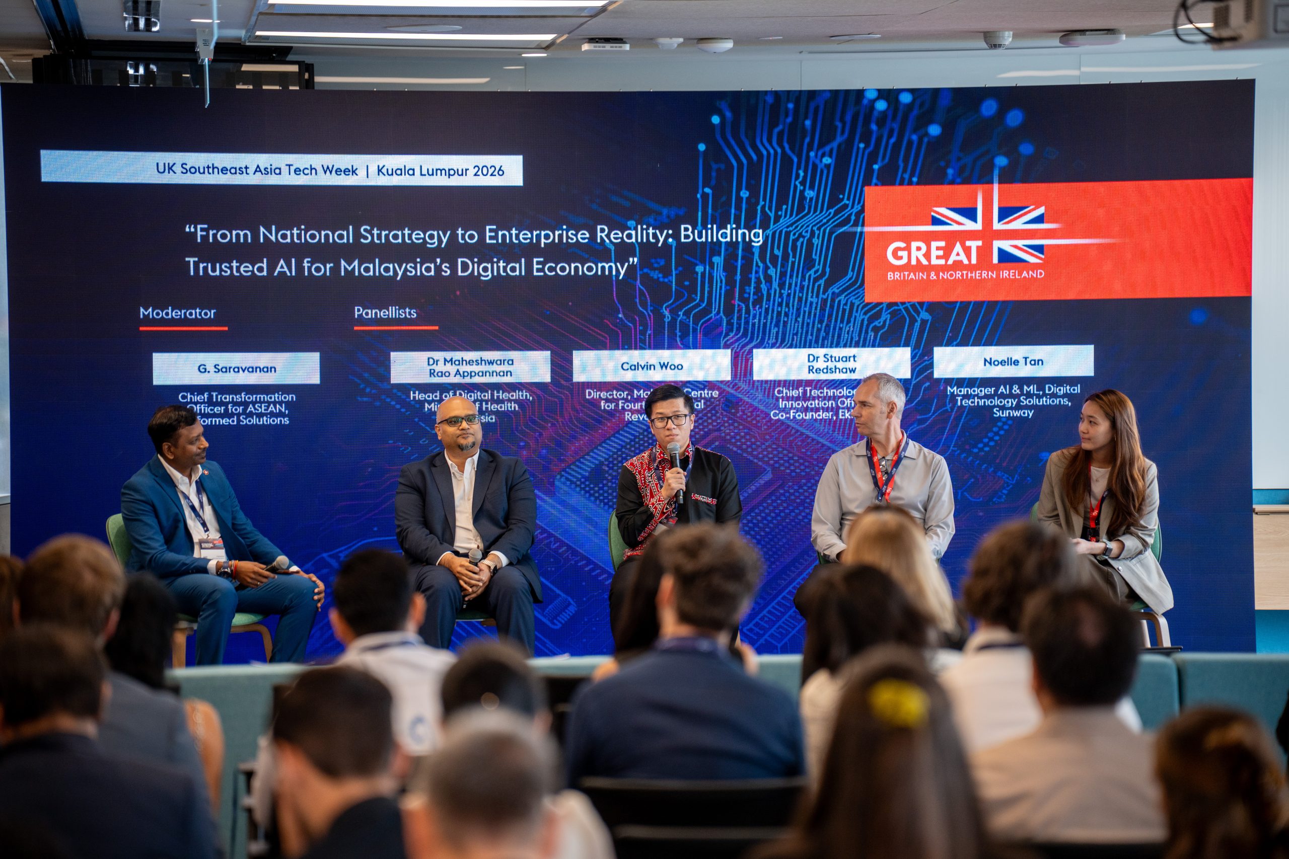 The first panel discussion, “From National Strategy to Enterprise Reality: Building Trusted AI for Malaysia’s Digital Economy,” was moderated by G. Saravanan, Chief Transformation Officer for ASEAN at Informed Solutions. The session brought together Dr Maheshwara Rao Appannan, Head of Digital Health, Ministry of Health Malaysia; Calvin Woo, Director, Malaysia Centre for the Fourth Industrial Revolution; Dr Stuart Redshaw, Chief Technology and Innovation Officer & Co-Founder of EkkoSense; and Noelle Tan, Manager AI & ML, Digital Technology Solutions, Sunway.