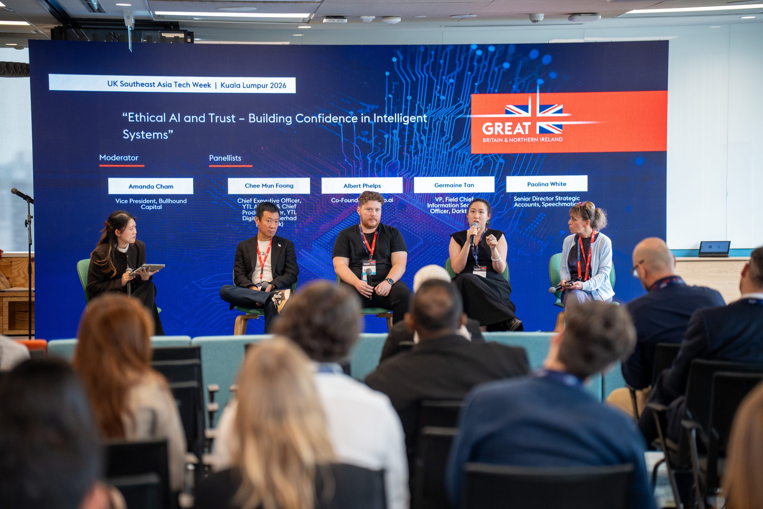 The second panel, “Ethical AI and Trust – Building Confidence in Intelligent Systems,” moderated by Amanda Cham, Vice President of Bullhound Capital, featured Chee Mun Foong, Chief Executive Officer of YTL AI LABS & Chief Product Officer of YTL Digital Bank Berhad (Ryt Bank); Albert Phelps, Co-Founder of Tomoro.ai; Germaine Tan, VP and Field Chief Information Security Officer at Darktrace; and Paolina White, Senior Director, Strategic Accounts at Speechmatics.